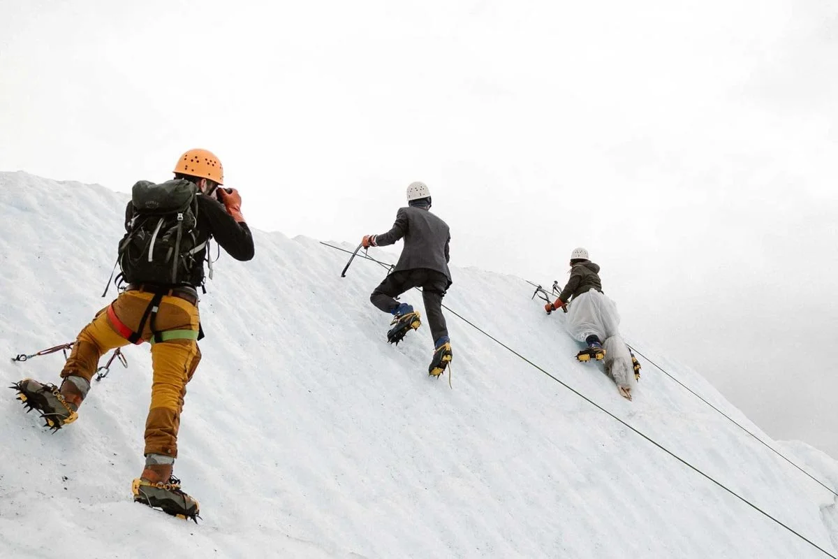 Photo of Mike tied into a glacier while photographing an eloping couple ice climbing in Alaska for their wedding day adventure!